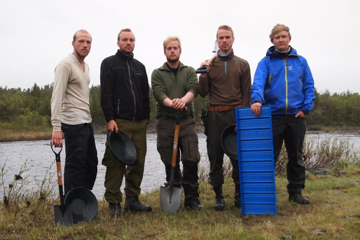 Gjennom en hel uke vasket denne studentgjengen gull. Ikke for å bli rike, inntekten var ikke mer enn noen hundre kroner fordelt på alle sammen, men for å ha litt enkel moro langt inne i den norske villmarka. Utgangspunktet var selvsagt de geologiske ressursene landet vårt råder over. Og Finnmark er som kjent et eldorado for feberhete gullvaskere. Alle de fem går på geologistudiet ved NTNU og ender i første omgang opp med en bachelor. Men med et så dedikert forhold til faget blir det i alle fall en mastergrad, og kanskje en doktorgrad. Det vil heller ikke overraske om noen av dem ender opp i bergverksindustrien. Fra venstre: Martin Stormoen, Hans Jørgen Kjøll, Emil Qvam, Eero Bekkedal og Ivar Hole. Foto: Gullgraverne