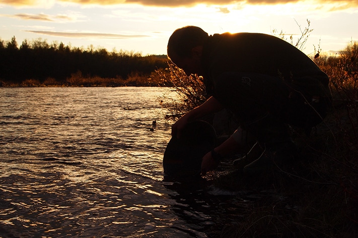 – Dette laget ble spadd ut, grovsortert og fraktet ned til elva hvor vi hadde installert en gullrenne, men før det kom så langt ble sanden sortert videre ved at vi ristet pannen under vann. Leiren kommer i suspensjon, de største steinene legger seg på toppen og kan plukkes ut, og gullet detter forhåpentligvis ned.