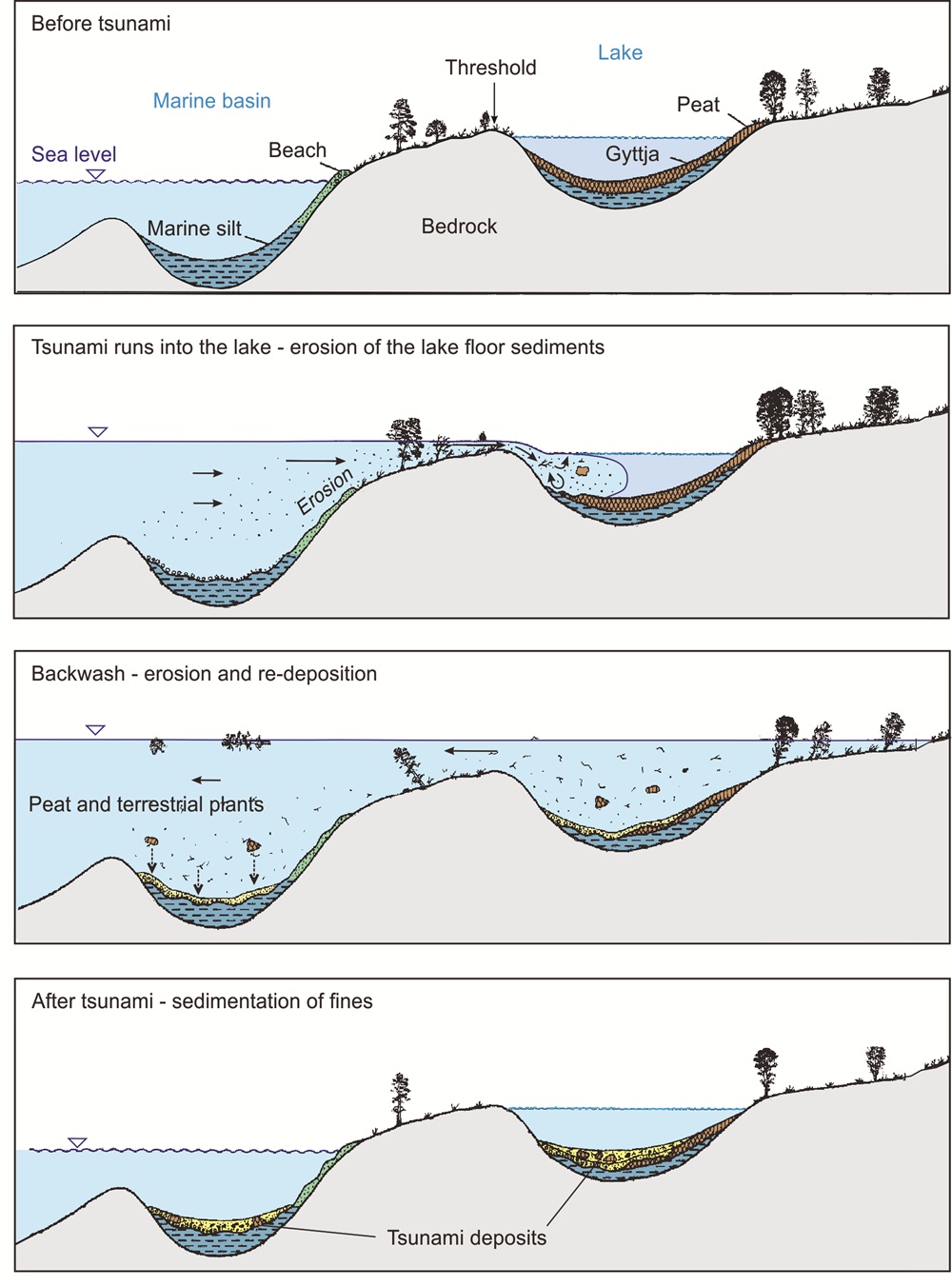 Når en tsunami treffer land, skjer følgende: havet trekker seg først enten tilbake, hvorpå bunnen blir blottlagt før den ødeleggende bølgen kommer som et inferno, eller bølgen treffer direkte med kolossal kraft og skyller vann langt inn over land (denne animasjonen illustrerer dette godt). Stranden eroderes og sedimenter avsettes. Du har kanskje sett bilder av modige ungdommer som surfer på bølgene som bryter mot stranden på Californias vestkyst? Vi kan sammenligne med disse brenningene, men tsunamiens kraft er uendelig mye større.