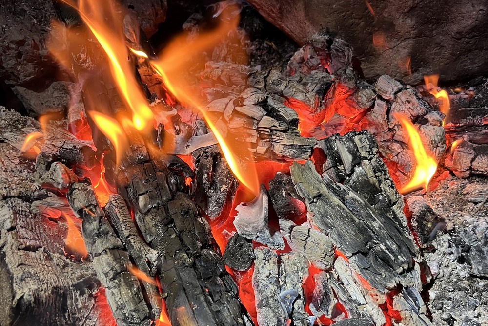 Bålet var samlingsstedet for steinaldermenneskene. De rød-oransje fargene hadde magisk tiltrekningskraft, noe som fortsatt gjelder, enten det er et leirbål eller en peisild. En flamme omtrent midt i bildet stikker opp fra en knokkel. Foto: Halfdan Carstens