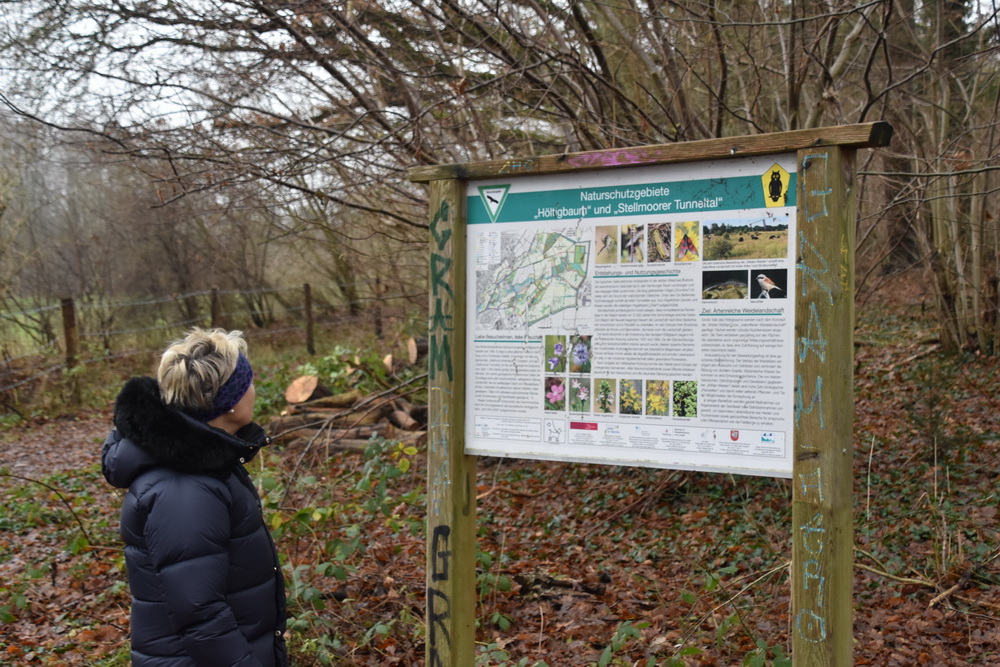 I tunneldalen nordøst for Hamburg skjøt steinaldermenneskene rein som trakk gjennom dalen. Slik ser det ut i dag. Villmark har blitt jordbruksland. Noen sauer gresser her og der, og grunnvannet gjør jorda våt. For en nordmann som er vant til dype U-daler er den ikke særlig imponerende. Foto: Halfdan CarstensStellmoor utenfor Ahrensburg (Schleswig-Holstein) har en sentral plass i forståelsen av flere steinalderkulturer. Men det eneste vi finner her som forteller historien om funnet, og hva det har betydd, er denne plakaten på kanten av tunneldalen der jegerne hadde sin standplass. I dag er landskapet dekket av løvskog og åker. I yngre dryas var det derimot kaldt, og på tundraen var vegetasjonen sparsom med mindre busker, urter og gress. Foto: Halfdan Carstens