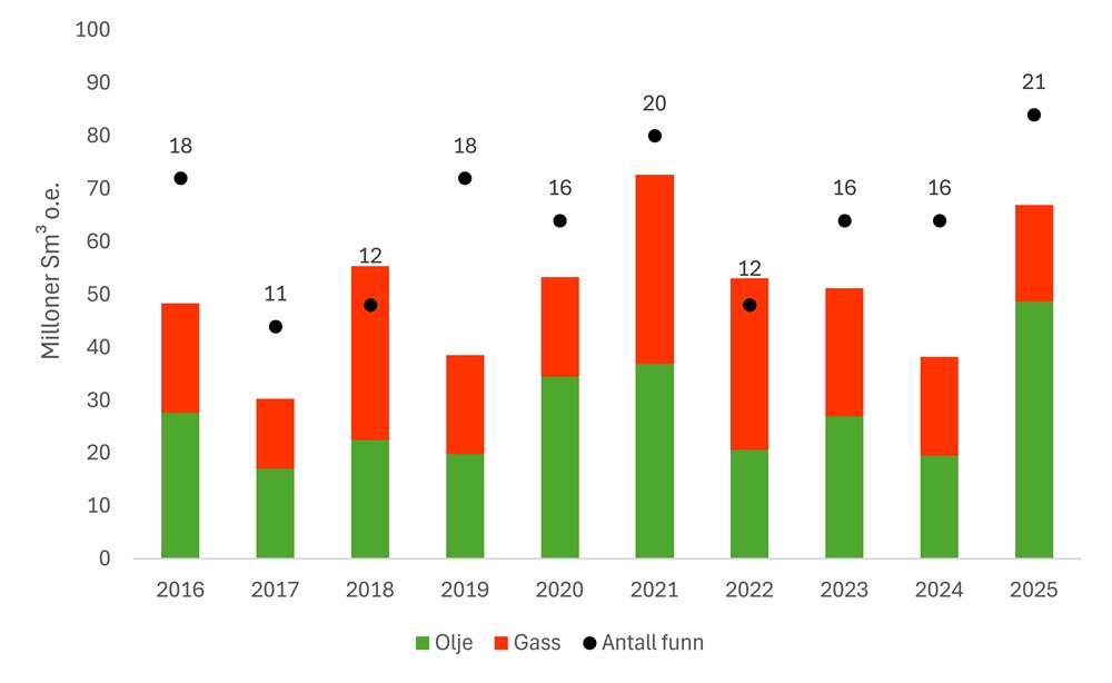 I løpet av året ble det boret 49 avsluttede letebrønner, som resulterte i 21 funn. Det samlede ressursanslaget er rundt 420 millioner fat oljeekvivalenter (mmboe). Dette gjør 2025 til det nest beste leteåret på norsk sokkel det siste tiåret – kun slått av 2021. Det er samtidig verdt å merke seg at oljefunnene var høyere enn i 2021, som vist i figuren under.