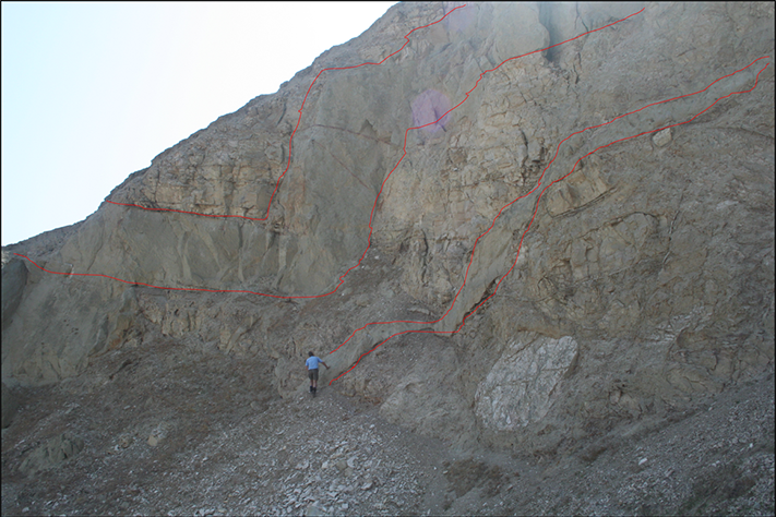 Bildet: Injeksjonssander finner vi ikke på land i Norge. Det er nødvendig å reise til USA, eventuelt Frankrike og noen få andre land, for å sammenligne data fra undergrunnen med formasjoner som går i dagen. Bildet er tatt i forbindelse med at en liten gruppe fra Aker BP nylig var i California for å se på blotninger av samme type injeksjonssander som finnes i Volund-, Viper- og Kobra-feltene. Ekskursjonen var et ledd i det samarbeidet Aker BP har med Andrew Hurst ved Universitetet i Aberdeen. De lyse lagene er injeksjonssander, og vi får et godt inntrykk av hvor komplisert slike reservoarer kan være. Nicholas Satur som skala. Foto: Frode Karlsen, Aker BP