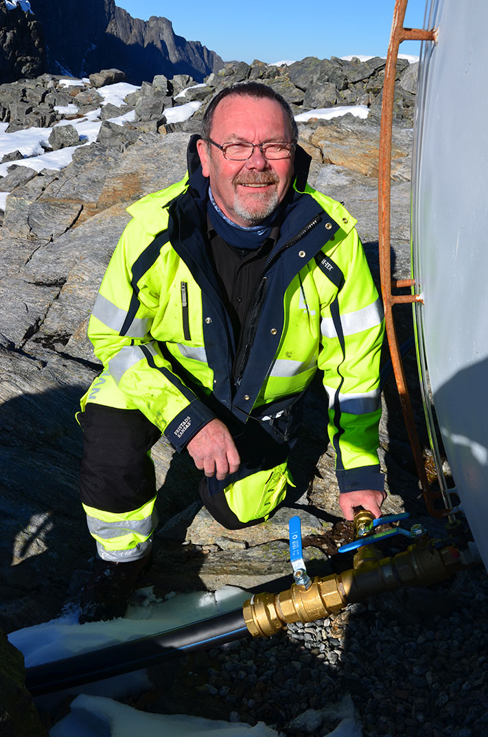 – Vannet pumpes inn i den store tanken og ledes deretter videre ned til de to mindre tankene som står på et lavere nivå, forklarer Åge Kjølås, overingeniør ved NVEs beredskapssenter i Stranda.