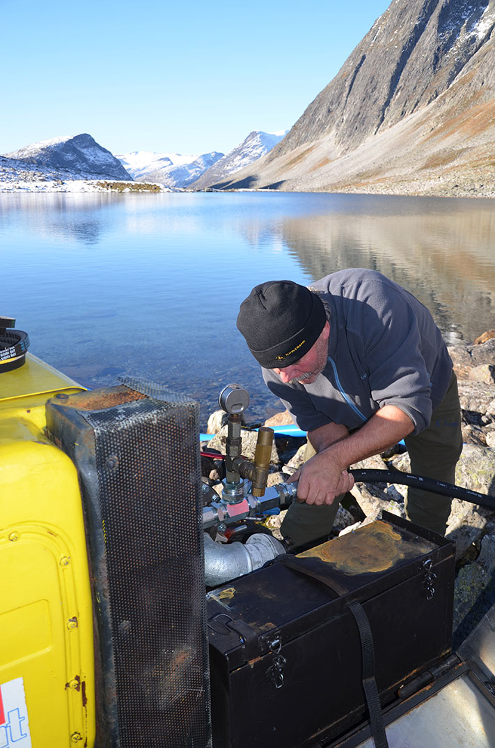Kjell Jogerud har ansvaret for at operasjonene går knirkefritt. I midten av oktober var alt klart for å prøve noe helt nytt innen skredforskning. Her monterer han pumpen som trekker vann fra tjønna og sender til tre store tanker 250 meter høyere oppe. Foto: Halfdan Carstens