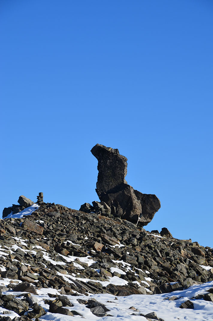 Fjellet Mannen (1294 moh.) har navn etter denne figuren som kikker ut over Romsdalen. Foto: Halfdan Carstens