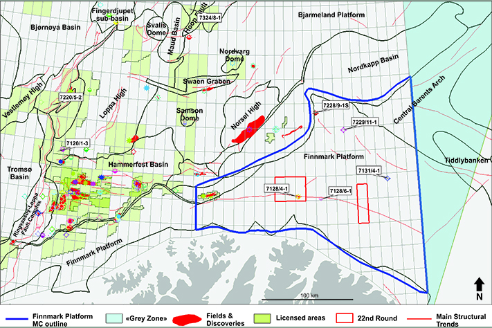 Det blå polygonet viser omrisset av det området som AGR-studien dekker. I nord og vest grenser det mot Nordkappbassenget, mens det i sør strekker seg helt inn til kysten. I øst begrenses det mot Barentshavet sørøst. Resultatene har derfor også relevans for dette området. Tre av fem borede brønner på Finnmarksplattformen viser spor av hydrokarboner i lag av karbon, perm, trias eller jura alder. Et teknisk funn i permiske kaldtvannskarbonater i 7128/4-1 bekrefter at Finnmarksplattformen har et aktivt petroleumssystem. Illustrasjon: AGR