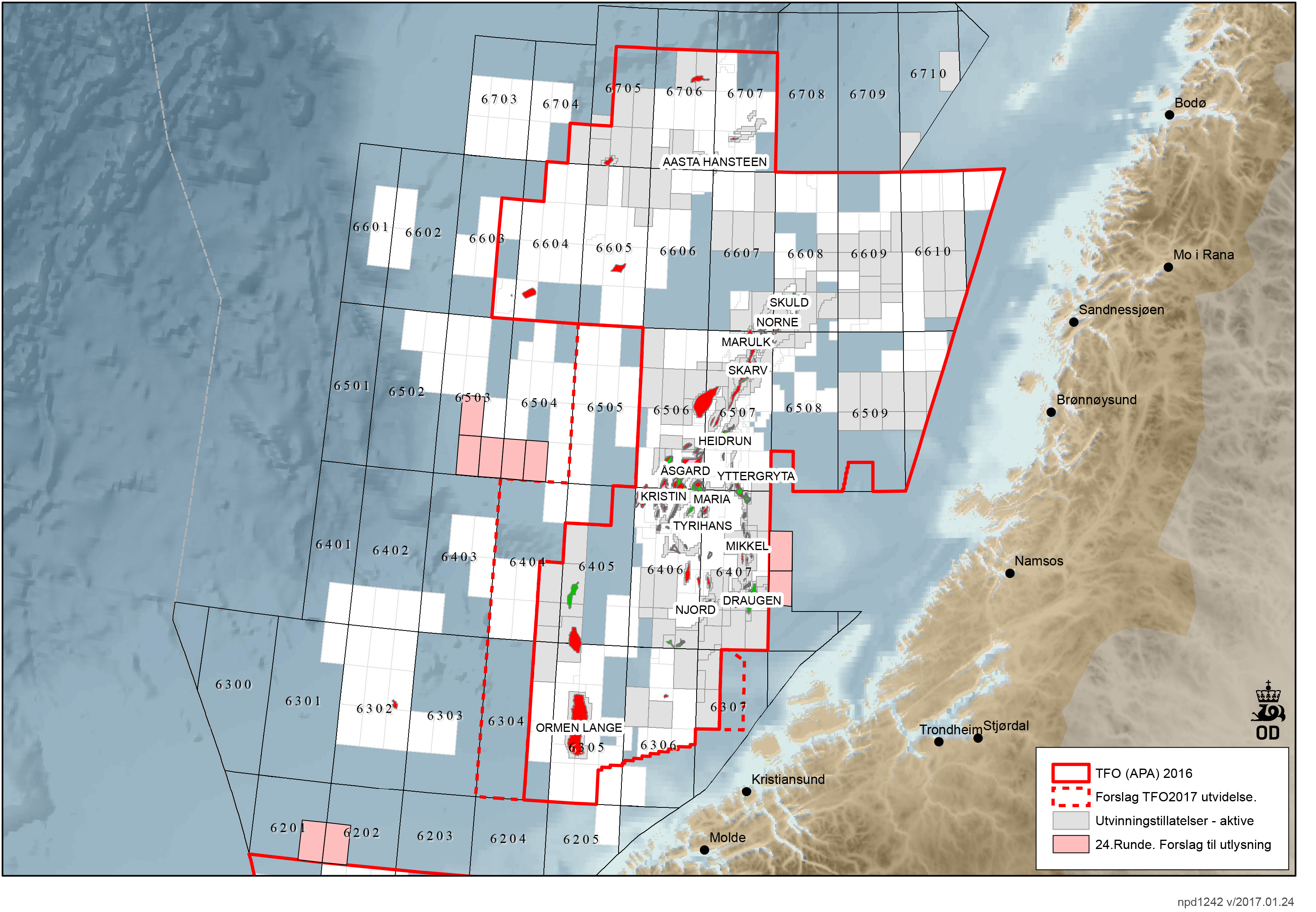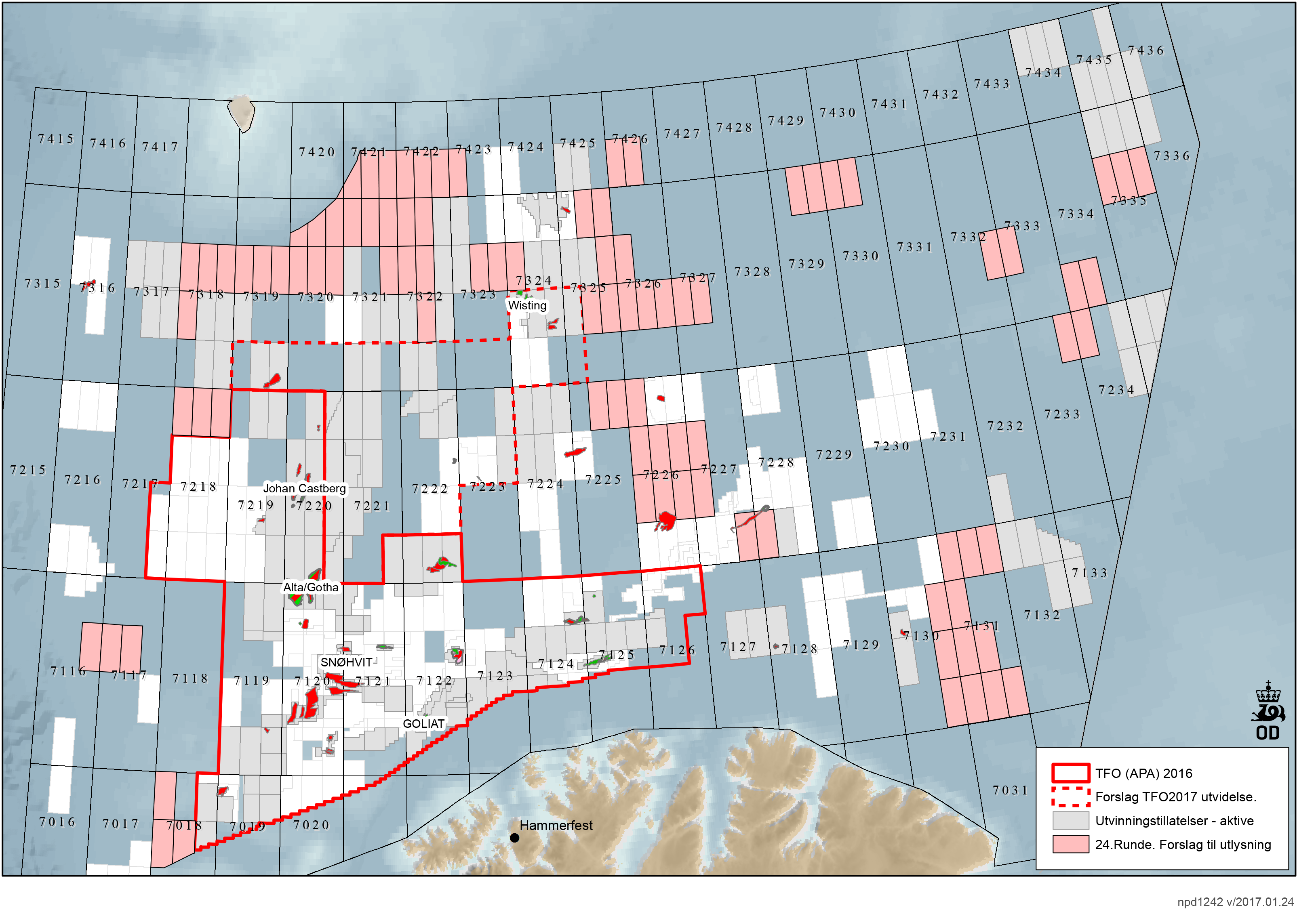 Olje- og energidepartementet sendte 13. mars 2017 ut forslag om blokker til utlysning i 24. konsesjonsrunde på offentlig høring. Forslaget inkluderer totalt 102 blokker fordelt på ni blokker i Norskehavet og 93 blokker i Barentshavet.