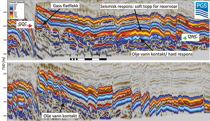 – Den aller sterkeste indikasjonen på at det er hydrokarboner i systemet – og spesielt olje – er den doble flatflekken i hovedprospektet vårt, der den øverste er sterk og klar og sannsynligvis representerer grensen mellom gass og olje, mens den nedre er mye svakere og har blitt tolket til å representere grensen mellom olje og vann.