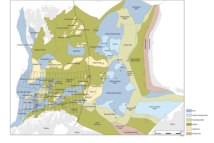 Barentshavet sørøst, der 34 hele eller deler av blokker ble lyst ut i den 23. konsesjonsrunden, er navnet på den delen av det tidligere omstridte området som Norge fikk råderetten til gjennom forhandlinger med Russland. Delelinjespørsmålet ble avklart i 2011, og Oljedirektoratet samlet deretter inn ny seismikk både i 2011 og 2012 for å få en bedre regionalgeologisk oversikt. Senere er deler av området dekket med 3D seismikk, EM-data og geokjemiske analyser. NGU har dertil samlet inn gravimetriske og aeromagnetiske data. Illustrasjon: KUFPEC Norway