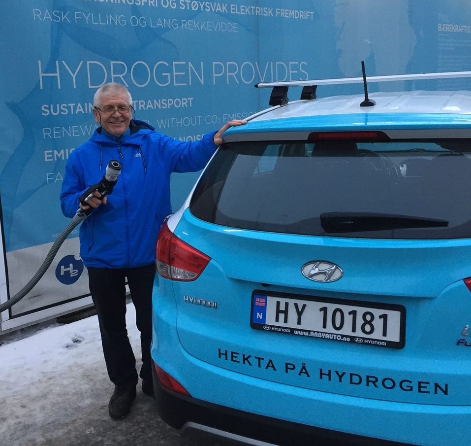 Forfatteren på Blindern hydrogenstasjon i 2018 med sin daværende hydrogenbil Hyundai ix35 fuel-cell 2014. Foto: Privat