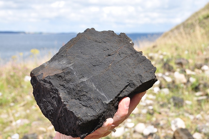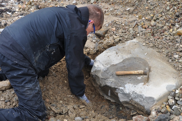Å lete etter fossiler i Moleret er en utbredt hobby. Unggutten har allerede funnet et lite eksemplar. Jobben består deretter i å hugge den ut av den knallharde sementsteinen – uten at den samtidig blir ødelagt.