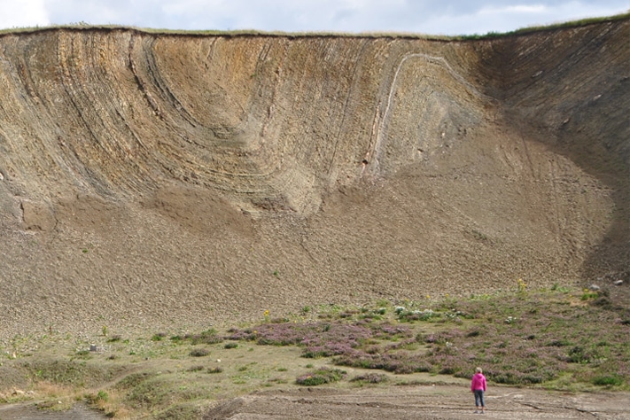 Legg merke til den markante folden midt i bildet. Lagene er av eocen alder, men foldningen skjedde sent i kvartær (for ca. 25 000 år siden) da ismasser fra nordvest presset på og skjøv leirstein, askelag og glasiale avsetninger over hverandre. Dette er samme type strukturgeologi som observeres i fjellkjeder som for eksempel Alpene og Kaledonidene. Men her ved Limfjorden er det altså snakk om glasialtektonikk, ikke platetektonikk.