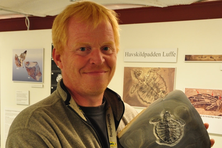 Henrik Madsen bestyrer Molermuseet lengst nordøst på Mors. Molermuseet har en stor samling med trær, fisk, insekter og planter som har blitt funnet i Moleret. Her poserer den sympatiske amatørgeologen med Luffe, hans favorittfossil: en havskilpaddeunge som han selv har funnet, og som ekspertene mener er det aller best bevarte eksemplaret i verden av en så gammel skilpadde. Luffe ble funnet i sementstein, og det tok finneren dager og uker med pinlig nøyaktig arbeid for å få den ut.
