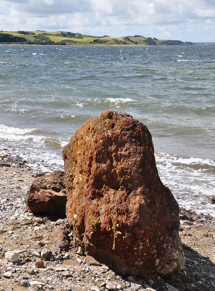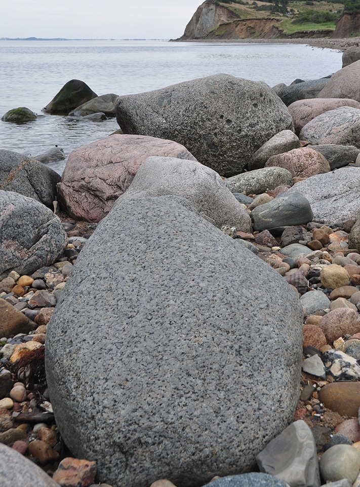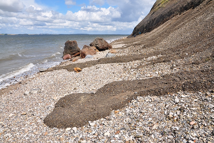 Klippene er for øvrig et kapittel for seg. De ble dannet da havet steg etter at innlandsisen over Skandinavia smeltet bort og smått om senn oversvømte hele Danmark. Bølgene begynte å grave og skapte de bratte kantene gjennom tusener av år. Bølgeerosjonen har fortsatt stor kraft når nordavinden får skikkelig tak, og derfor vil det alltid være friske snitt å studere i de geologiske lagene. Samt stadig ny nedfallsstein til glede for fossiljegerne. Foto: Halfdan Carstens