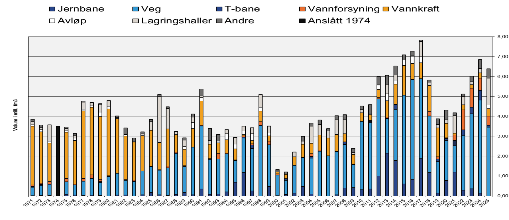 I 2025 ble det tatt ut godt og vel 6 millioner m3 masser fra norske tunnel- og bergromsprosjekter, hvorav veiprosjekter dominerer.