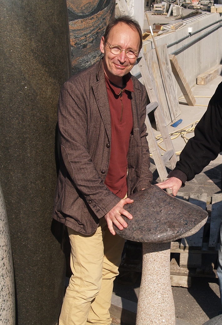 Like fullt er den erfarne steinhuggeren godt fornøyd med skulpturen som ligger ved inngangen til Oljemuseet i Stavanger. Selv om den ikke er like berømt. Han er nemlig litt stolt av den. For han har selv vært med og hentet råmaterialet – Brumundalssandstein fra mjøstraktene. Bedriften gjorde resten på oppdrag fra Oljemuseet. Kristian Blystad stod for den kreative delen. Han er en av de mange kunstnerne som har fotfeste hos den ivrige og dedikerte steinhuggeren i Skjeberg.