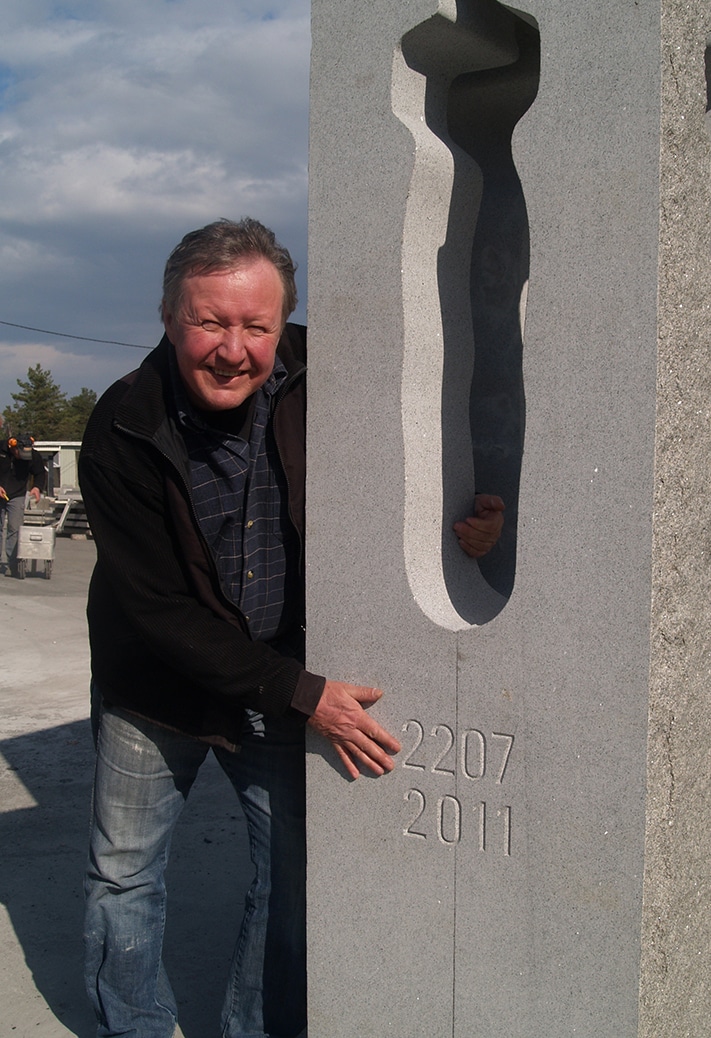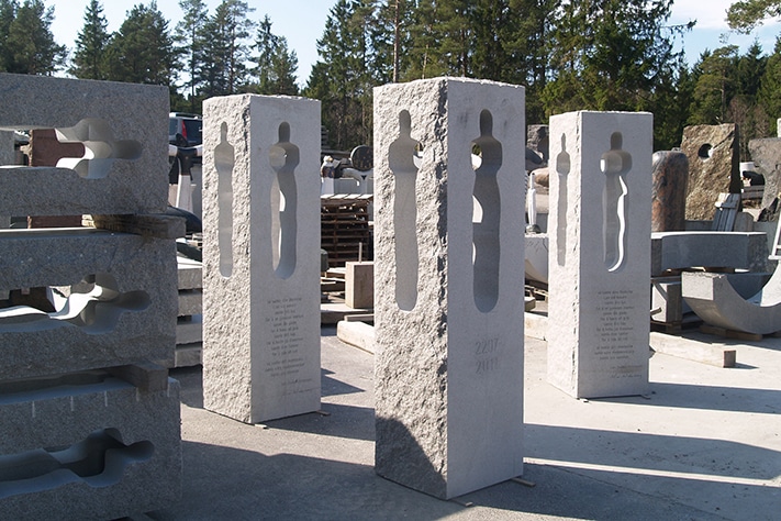 Vi snakker om en 220 cm høy skulptur med en stilisert mann- og kvinnefigur i tre dimensjoner, sagd ut med diamantwire, tekst av Lars Saabye Christensen, sandblåst inn i steinen, og tallene 22 07 2011, hugd inn for hånd på gammeldags vis. Råmaterialet er selvsagt Iddefjordsgranitt, og nabobedriften Jogra leverer blokkene.