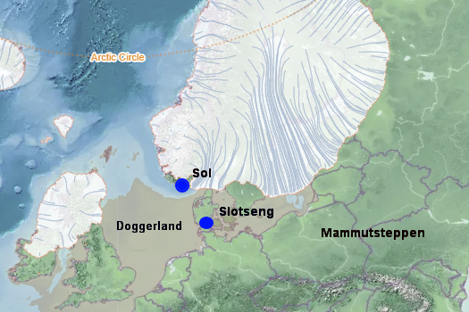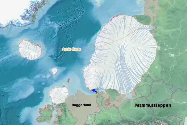 Innlandsisens utbredelse for 15 000 år siden (ved avslutningen av eldste dryas). England, Doggerland, Nord-Tyskland, Danmark og det sørligste Sverige (til nord for Vänern og Vättern) er fortsatt fri for is, og bare i Storbritannia og Irland har de isfrie områdene blitt merkbart større. Stedet der Sol [geo365.no: Prolog: Et eldgammelt skjelett] ble funnet nærmere 6 000 år senere er markert. Illustrasjon: Icemap-no – Icemap