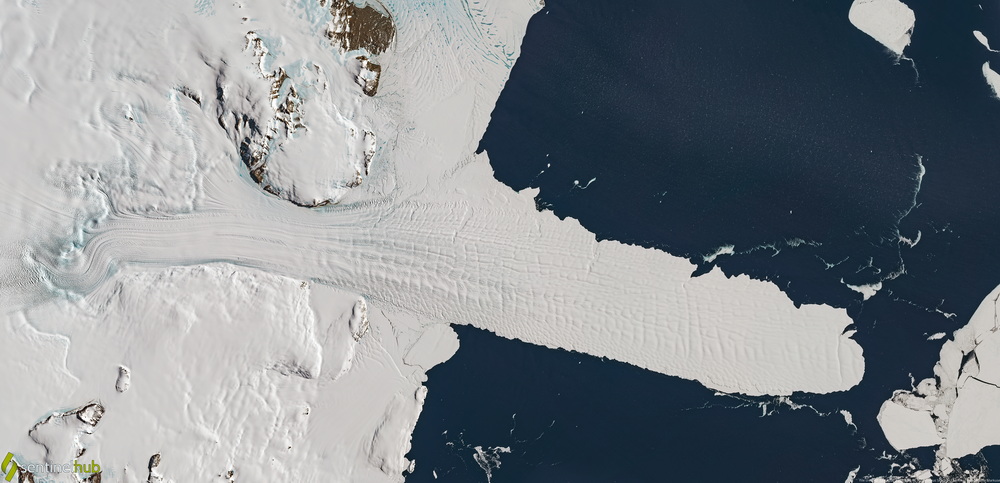 Isstrøm med istunge som flyter ut i McMurdo-sundet i Antarktis.