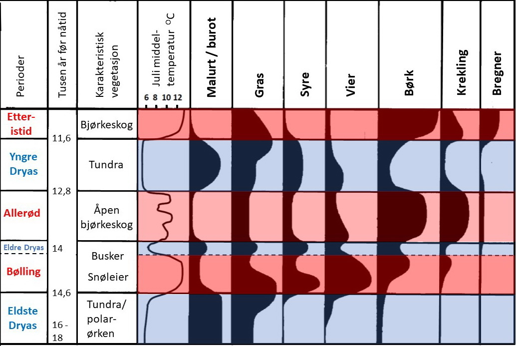 Lengst til venstre viser temperaturkurven at somrene var kalde. I juli måned var gjennomsnittstemperaturen på Vestlandet bare seks grader. Det er ganske likt sommertemperaturene i Longyearbyen i dag[6]. Botanikerne gir derfor vegetasjonen karakteristikken høyarktisk. Som vi så i forrige artikkel (geo365.no: «Kalksteinshuler ble redningen»), tilsvarer dette temperaturene i Sør-Frankrike under siste istids maksimum.