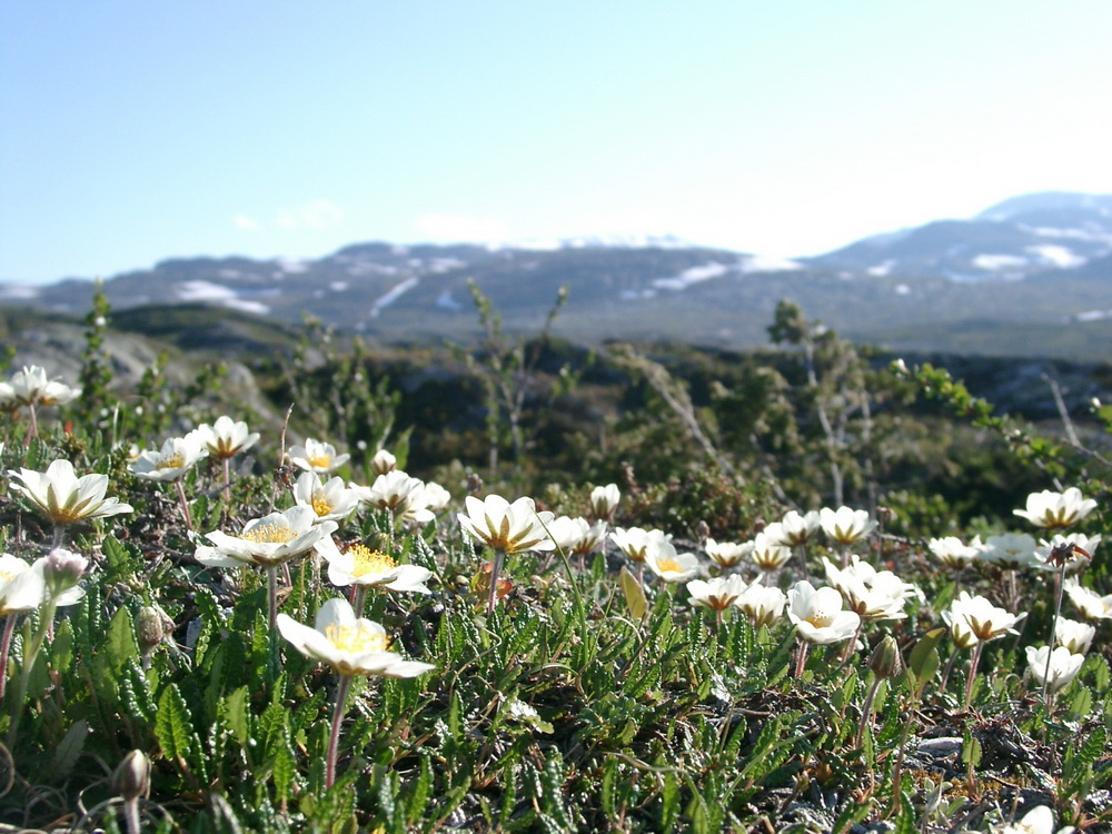 Reinrose – dryas octopetala – tåler lange periode med barfrost og er typisk for den danske vegetasjonen gjennom eldste, eldre og yngre dryas. Den krever litt jordsmonn og var derfor ikke vanlig i Norge gjennom de tidsperiodene. Foto: Aage Paus