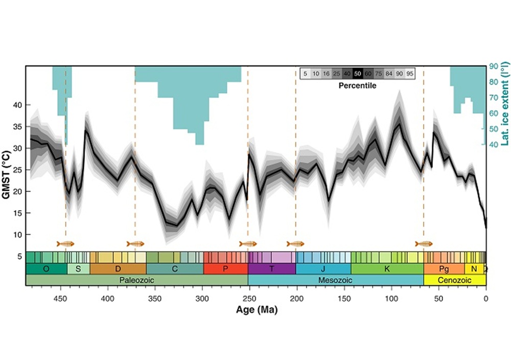 PhanDA. Global overflatetemperatur siden begynnelsen av ordovicium (485 ma). De blå rektanglene viser maksimum isutbredelse som funksjon av tid og breddegrad, mens de oransje linjene viser tiden for de fem største masseutdøingene gjennom fanerozoikum. Figuren viser tydelig at vi er inne i en istid. Menneskenes tid på Jorda (de siste seks til sju millioner år) er i sin helhet knyttet til et kaldt og stadig kaldere klima. https://www.science.org/doi/full/10.1126/science.adk3705#F3