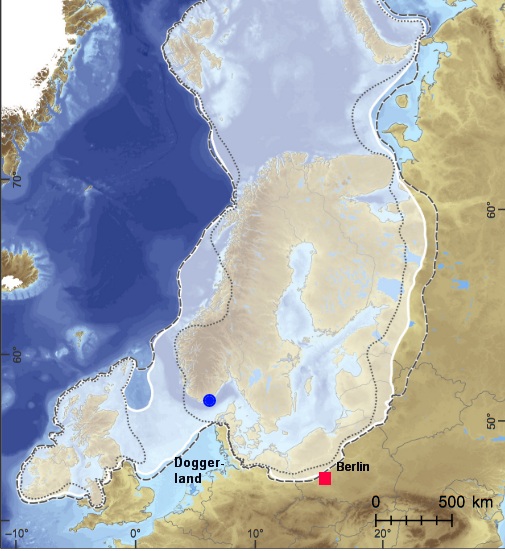 «Istiden». Siste istids maksimum i Europa. Antatt utbredelse av innlandsisen på sitt største (22 000 år siden). Stiplet linje viser maks utbredelse, minimum er prikket linje, mens heltrukken linje viser «mest sannsynlig» utbredelse. Legg merke til at forskerne bak figuren langt fra er sikker på at Nordsjøen var dekket av innlandsisen. Funnstedet for Sol (Se Artikkel 1 Prolog) er avmerket med blått.