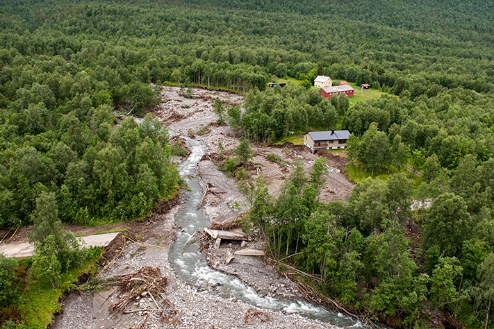 – Intens nedbør og økende vannmetning i jorda resulterte i mange løsmasseskred. De fleste skredhendelsene var flomskred som startet øverst i bratte fjellsider, ved at rennende vann eroderte kraftig i elveløpenes løsmasser, forteller Devoli.