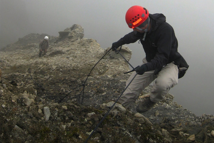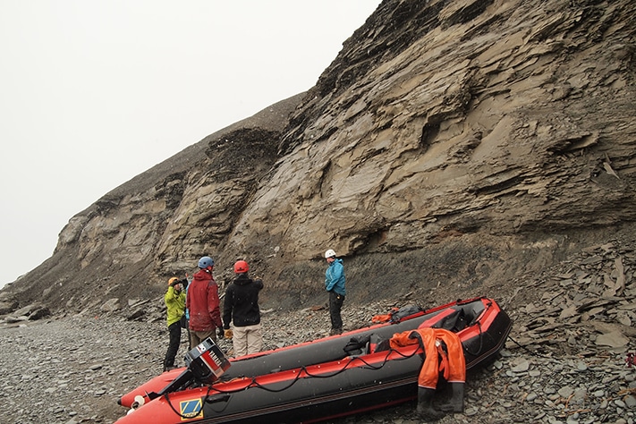 Og ekte geologer klager ikke over tett tåke, vått regn, kald sludd, sur vind og kraftige brenninger. Såpass må man tåle når man skal drive geologisk kartlegging i Arktis. Men utstyret må være i orden, alt fra overlevelsesdrakter, gevær og hjelm til hammer, lupe og notatbok.