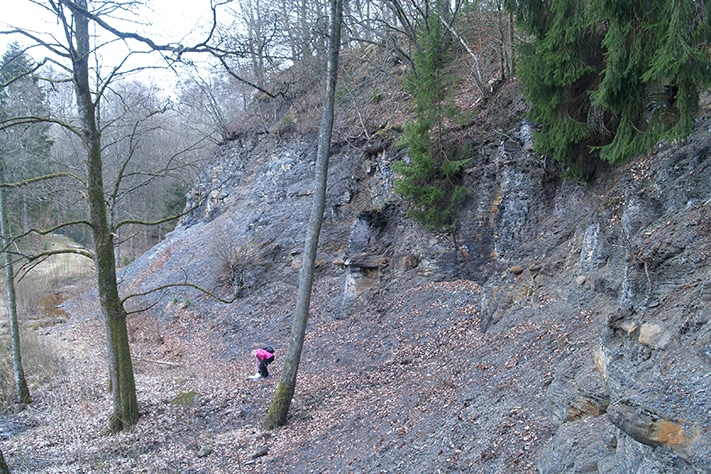 Magnus er vår guide når vi drar ut til et av de få stedene i Skåne det er mulig å stifte bekjentskap med alunskiferen på overflaten. Langt øst i fylket leder han oss til det gamle dagbruddet hvor det i 275 år har blitt tatt ut svart skifer i en industriell prosess. Produksjonen er for lengst slutt, men stedet er en severdighet for både kultur- og geologiinteresserte.
