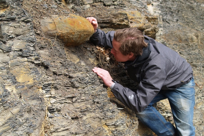Men nå er det nok prat. Magnus vil ut i dagbruddet og se på stein og lete etter fossiler. Et utrenet øye har problemer med å få øye på dem, men med litt øvelse går det lettere.