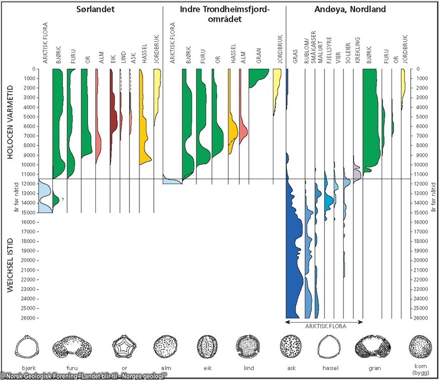 Pollen er kun viktig for befruktning lokalt. Pollen fra kontinentet fant neppe veien til hunnblomster som fantes i Norge kort tid etter Istiden. Det var derfor frø som bidro til et rikt planteliv i et mildere klima.