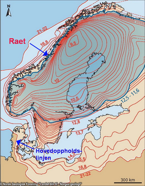 Vi kjenner denne markante grusryggen som Raet. Den er kartlagt over hele Norden og forteller om det siste brefremstøtet som markerte slutten av siste istid. Den forteller derfor også om innlandsisens største utbredelse i forkant av holocen. Noen steder ligger den på land. Andre steder under vann. Men enda mer av morenen lå under havnivå da den ble avsatt. Årsaken er at den senere landhevningen har «løftet» den opp, og at kystlinjen har flyttet seg lenger utover.