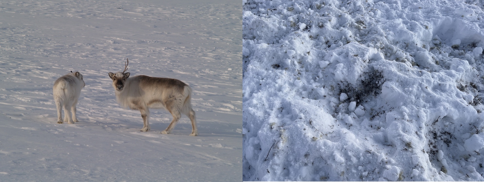 Om vinteren, etter at bakken igjen har kledd seg i hvitt, må den klore seg gjennom snøen og nøye seg med lav (masse energi) og noe lyng, samt hva den ellers måtte finne på åpne rabber der vinden tar ekstra godt. Det er en krevende oppgave, selv om den har store klover som egner seg til formålet. Halve dagen kan gå med til å grave. Gode vinterbeiter kjennetegnes derfor av små snømengder.