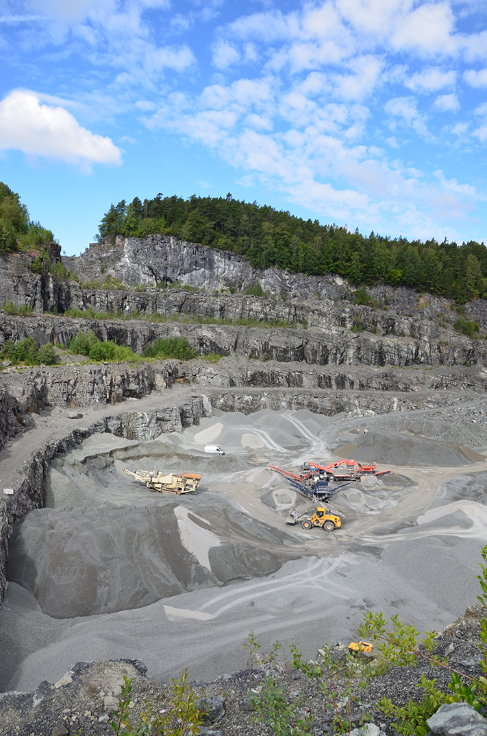 Det er Kjørholt, det gamle dagbruddet i Dalen gruver, at fabrikken for behandlingsanlegget er planlagt. I dag benyttes plassen til et pukkverk. I luftlinje er dette ca. 500 meter fra nærmeste bebyggelse. Inngangen til gruven ligger tett opp mot anlegget. Foto: Halfdan Carstens