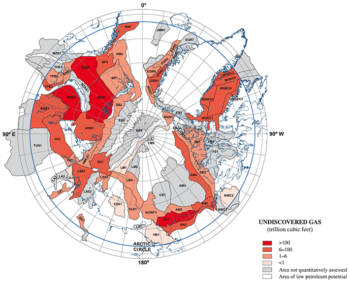 I følge USGS utgjør de arktiske kontinentalsoklene det største prospektive område på Jorden som fortsatt er lite utforsket («unexplored») med hensyn på olje og gass. Det aller meste av dette arealet tilhører Russland, og i det enorme havområdet øst for Karahavet (Laptevhavet og Det østsibirske hav) er det ennå ikke boret en eneste letebrønn. De antatt prospektive områdene nord for Canada og USA er også lite undersøkt. USGS tror likevel at potensialet er stort.