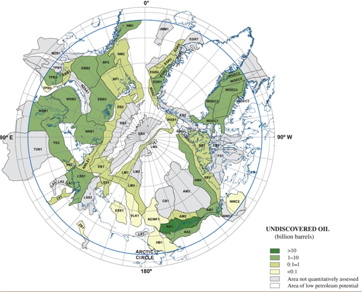 Den østlige delen av Barentshavet som tilhører Russland er en av disse. Også Grønland kommer godt ut. USGS mener kontinentalsoklene både på vest- og østsiden av den store øya kan inneholde store mengder olje. De aller største oljeressursene, en tredjedel, forventes imidlertid å ligge nord for Alaska (Arktisk Alaska).